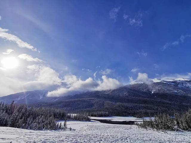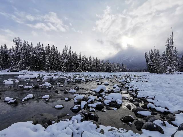 雪地摩托车下来,去了喀纳斯老村附近的湖边,一些人带着小朋友在附近坡地玩滑雪。走到湖边,好多可爱的小雪蘑菇,树上也挂着一些雪,像棉花团。湖水没有冻住,但两边有冰块,在阴影下是灰绿色,日光下却是晶莹的翠绿,玻璃一样层次分明,冰块之下和边上有齿状冰挂,各种新奇。虽然不敌后来春天在赛里木湖看到的蓝冰,但是在及膝的雪地里玩了一会儿也是找到了童年的快乐了。
