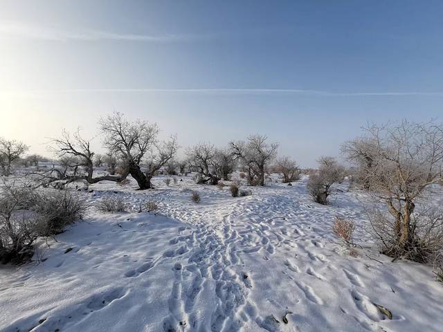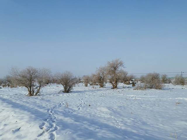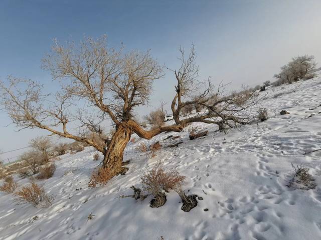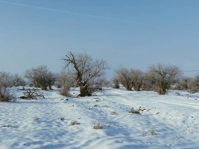 冬天的野生胡杨林,大大小小散开来,在路边遒劲又张扬。司机说,看过了哈密的胡杨林,看这里会觉得胡杨太小吧,其实没有。胡杨枝干上的雪轻轻落下来,地上的足印很快就被覆盖了,反而车辙印深深浅浅的纠缠,一路延伸。如果是秋天,在胡杨边上惬意地打个盹儿,肆意地看树叶由绿而黄,懒洋洋的晒日光,想想都沉醉不已。