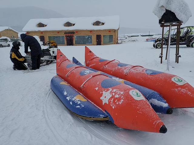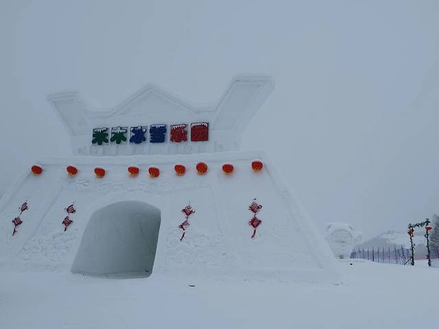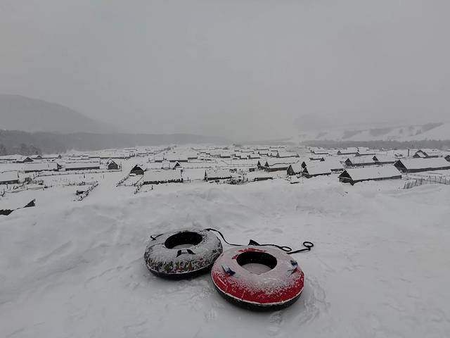 在村子里仔仔细细晃了一圈,往回走天已经大亮了。司机打电话来提醒去冰雪乐园。以为通票可以什么都玩的,结果只有滑滑梯、香蕉船、碰碰球而已,雪地摩托仍然是另外的价钱。滑滑梯是要自己抱着轮胎上去的,费力费神,还卡顿,玩了一个就悻悻然,还不如我摔跤了一屁股滑下去痛快。宣传里的很多东西都没有,内容很单一,没有东北的刺激。香蕉船又太残暴太刺激,我都快飞出去了。因为下雪,没有太阳,很多想去观景台拍日出的人落了空,意外的收获是在人造滑梯旁发现了拍小木屋的绝佳角度,窃喜。