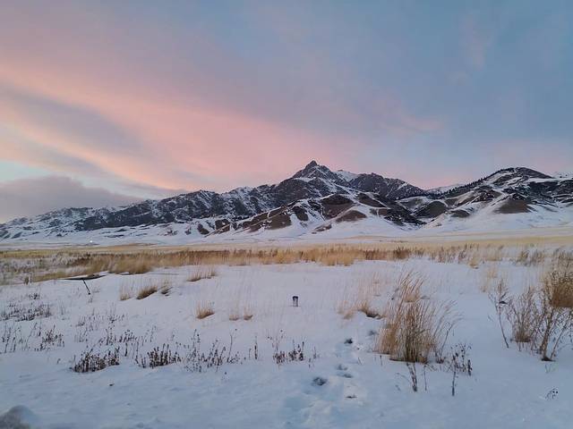 赛里木湖的花季大概是最美的,但这个冬天不太冷,才零下几度,湖里湖边都是粉雪,还没有成型的冰泡泡,自然看不成蓝冰,更别提邂逅小狐狸了。天黑得令人措手不及,紧巴巴的往博乐赶。