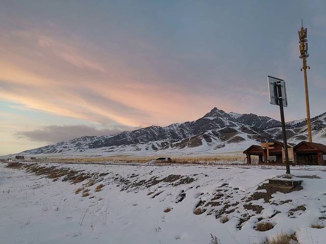 到景区的时候,已经7点。所幸淡季无人,可以直接开车进去。天空突然亮堂起来,美得像画卷。视野里触手可及的连绵雪山、木栈道旁摇曳的枯草滩、山的一边粉粉的天空、湖的一边满天的彩霞、道路的尽头夕阳的余晖,如一沓沓天幕四面八方扑面而来。我嘎吱嘎吱的踩在雪地里,仿佛无忧无虑的小时候,全然不觉寒风凛冽。这华丽的日落,只持续了半小时,却填满了我的记忆,果然天不负我。