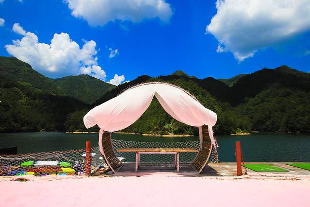 还有粉色的沙滩可以在这里拍出美照,天气真好,蓝天白云下,湖水很清,水上乐园进来的时候是要单独买票的哦。