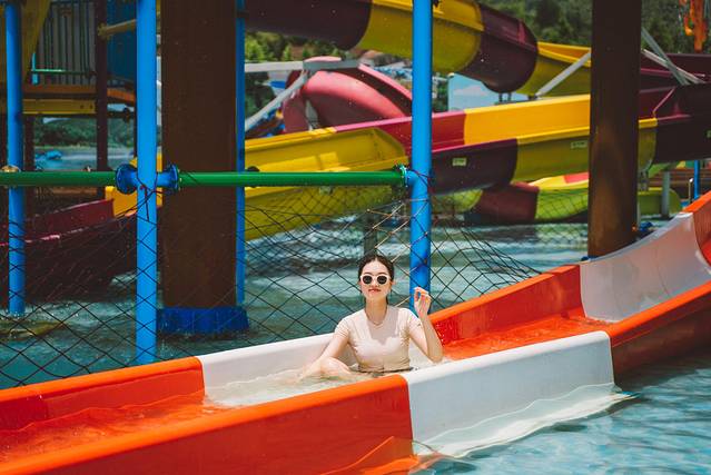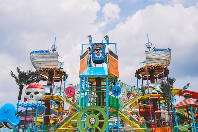 欢乐水寨是一座海盗主题风格的水上狂欢乐园,占地足足有2000平方米,汇聚了彩虹滑梯、螺旋滑梯、高速滑梯等12座滑梯,最长最刺激的螺旋滑梯有三层楼高,一滑而下的刺激感让我瞬间尖叫起来。