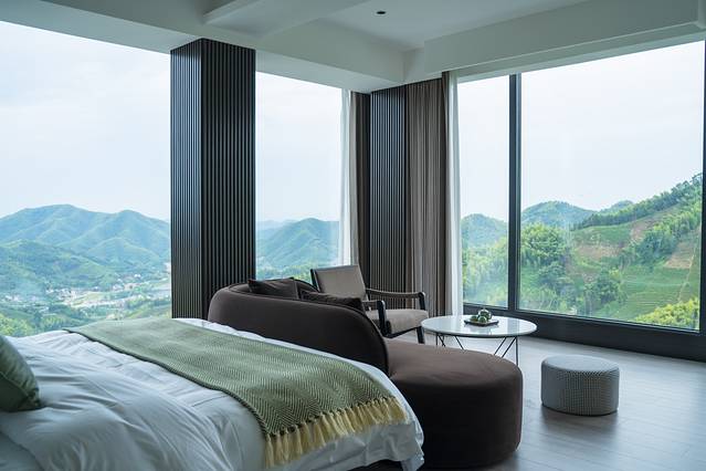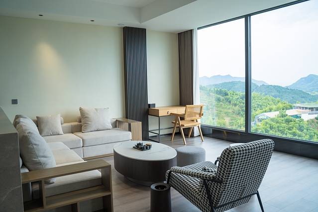 民宿的软硬件设施也是非常的棒,四周竹林环绕,山间的鸟鸣声都能听到;客房的硬件设施也是非常的不错,全景大落地窗,无论是在客厅,还是房间亦或是在浴缸里泡澡,都可以180度无死角的欣赏到前方翠绿的山峦、竹林、茶田。