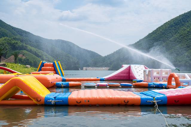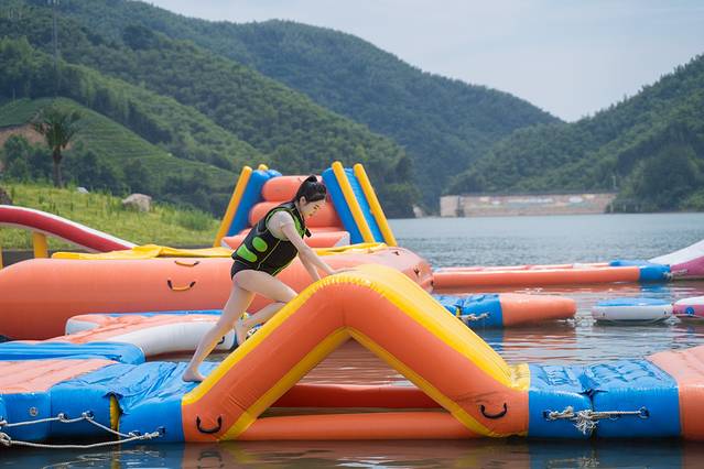 就在阳光沙滩旁的水边,摆放着一个巨大的水上气模,这是一个水上的充气式的闯关赛道,穿戴好救生衣,从起点出发,越过一个又一个的障碍物,玩的累了就坐在上面用脚踢踢水、吹一吹湖面的微风,这一刻的惬意也只有亲身经历才能真正感受到。