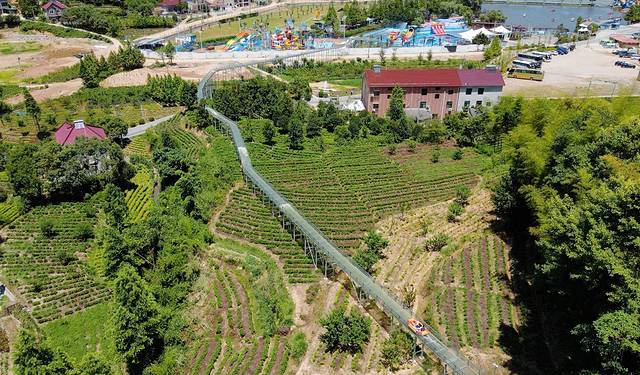 当无人机飞向天空,向下俯瞰又能发现这个漂流的独特之处,这个云端漂流采用颠覆传统的漂流方式,将透明的玻璃滑道建在竹海之上,俯瞰整条滑道,就好似一条巨龙盘踞在山林之间,颇为壮观。