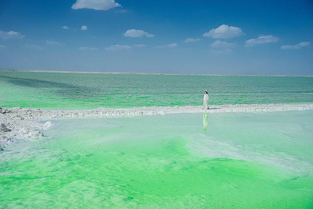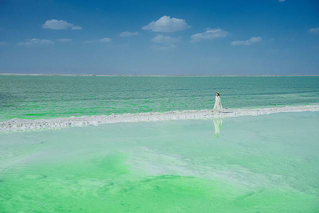 察尔汗盐湖,比茶卡足足大了50多倍。与翡翠湖一样呈现绿,却比翡翠湖和茶卡盐湖游客少上许多。虽不算特别小众,但跟团常常不来到这,因为与常规的线路并不顺路。