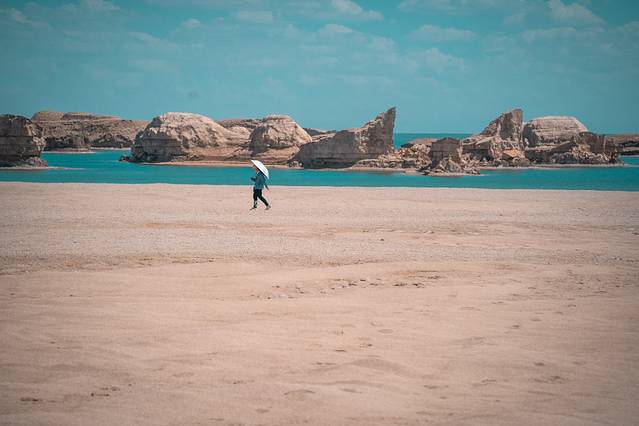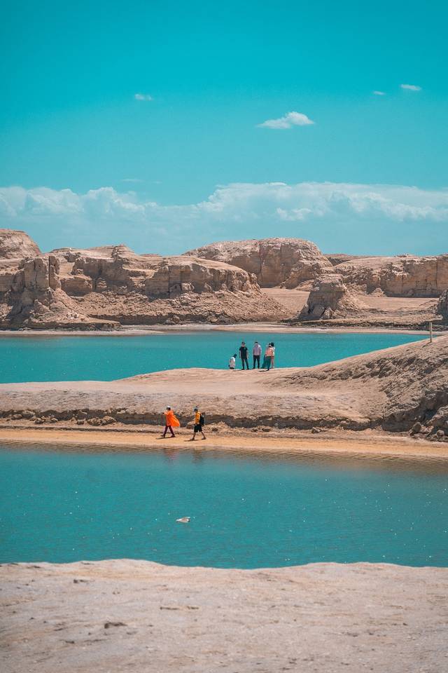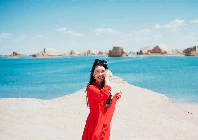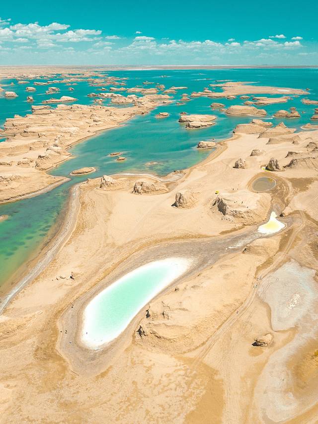 眼前路过的湖水一忽儿深碧,一忽儿浅蓝,而经千万年风蚀形成的雅丹群,则星罗棋布地落在这片碧蓝之中,构成一幅神奇画卷。远远望去,那些形状怪异的岩石被湖水浸没,裸露部分如岛礁、如船帆、如舰艇,足可以组成一支远洋船队,颇有万舰出海、浩浩汤汤的气势。耳边的风声如波涛在咆哮嘶吼,隐隐似有远古的罄音传来,在天水之间盘旋回荡,让人心游万仞,精骛八极,觉得心魂飞升,倏忽到了地球之外的另一个神秘世界。气好的时候根本无需修图随手拍就震撼的封面大片。