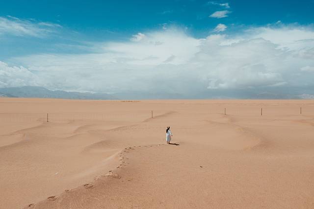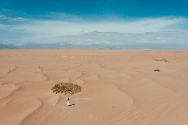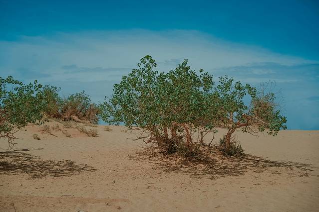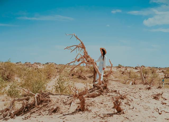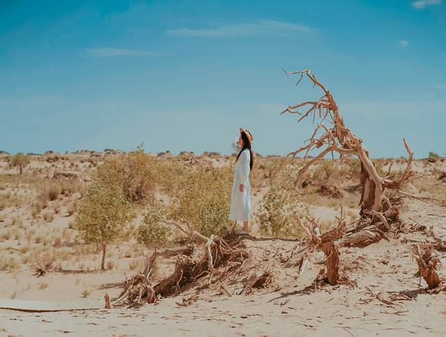 一个人行走在茫茫沙漠中,白云铺满天空,或是在胡杨之畔行走,这里的苍茫和震撼让人一下子变得渺小且敬畏世界。怪不得那么多文人墨客会留下那么多赞美胡杨的诗篇,传颂了一代又一代。