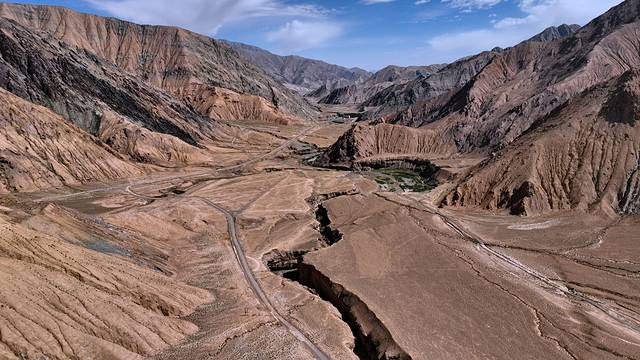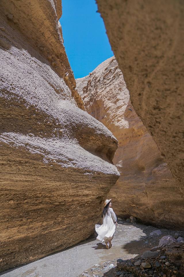 昆仑山大峡谷全长12公里,“一区三谷”,分别为羚羊谷、雪山峡谷和大峡谷,深入峡谷中每一个场景都特别震撼,天空中浮现的一线天,巨大的石林堆砌在眼前,万年雪山融水冲蚀雕刻而出的年轮,造型奇特,如同大地的裂痕一般,狭窄、险峻、崎岖,随手一拍都是电影海报般大片儿。