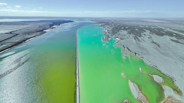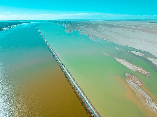 在乌素特水上雅丹和东台吉乃尔湖不远的地方,还有一处大型的网红盐湖——西台吉乃尔湖,这条3公里长的水上公路,将湖面劈为两半,两边的湖水一半蓝、一半绿,被人们戏称为“一半海水,一半火焰”。