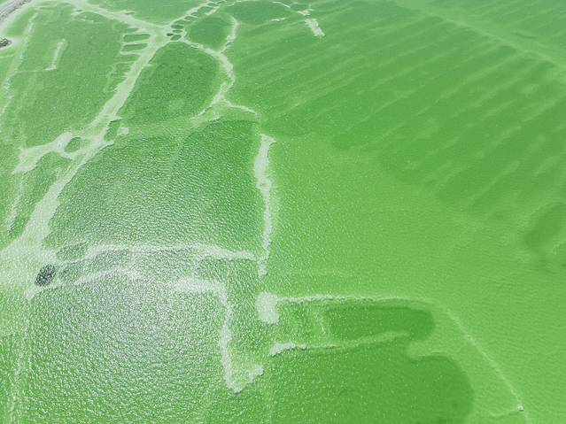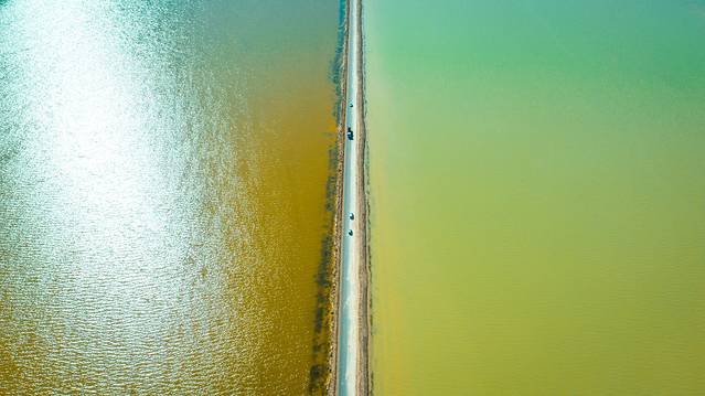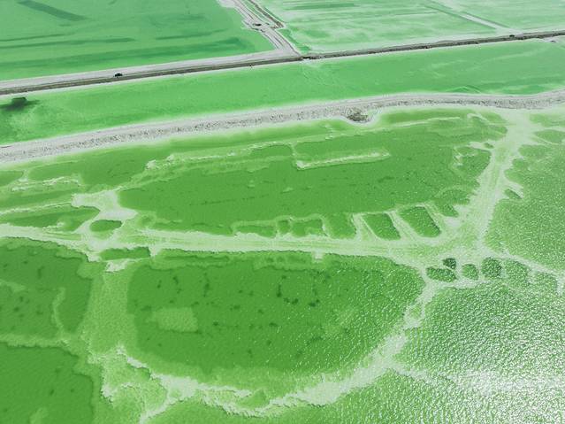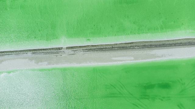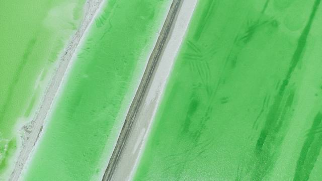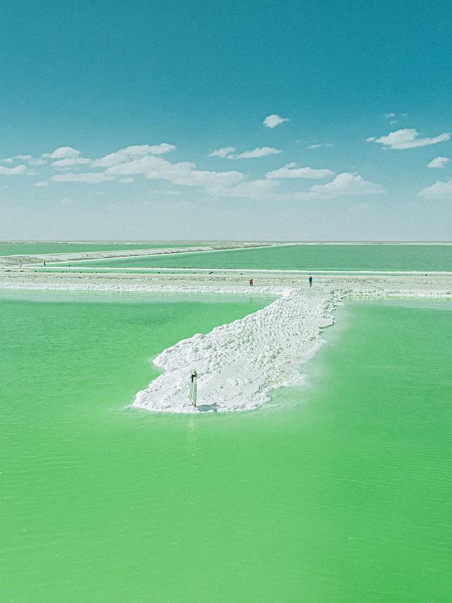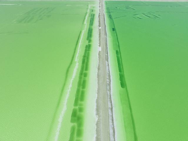 一切绿色植物在这里难以生长,湖面确是层层叠叠的渐变绿。湖面纵横交错的盐花,航拍飞起好似绿色大地的脉络。