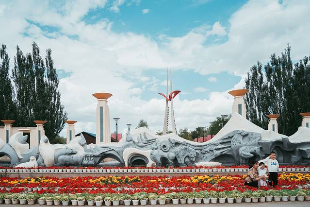 当我走进造型美观的大门,绕过百花争艳的花坛,首先印入眼帘的是一座标志性建筑——高大的天路纪念塔。它呈人字形,直插云霄,代表通往拉萨的公路和铁路。从下往上看,它像威武不屈的钢铁巨人。纪念塔的顶端装有一盏红色大灯,听说是报警用的。再看看脚下,是一块巨大的地形图,高低不平,错落有致,有高山,有河流,有各个地点的名称,我一下子就找到了格尔木市。这就是青海的全貌地形图。