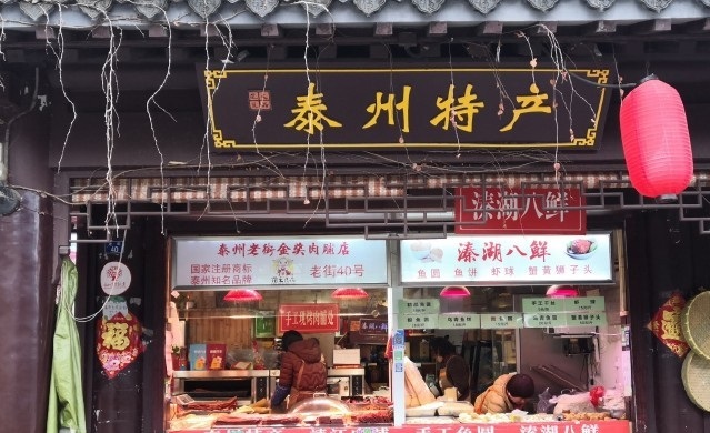 老街也被誉为是“苏中第一小吃街”,特色美食、老字号店铺鳞次栉比地排布着,如“老泰州泰州菜”,“海棠春”,“蔡家老店”等等。早茶店里一碟烫干丝、一份蟹黄汤包、一碗鱼汤面。还可以尝到“草炉烧饼”、“溱潼鱼饼”、“溱湖八鲜”、“红膏大闸蟹”等极富泰州地方特色的经典美味。