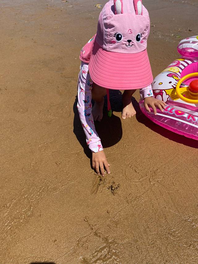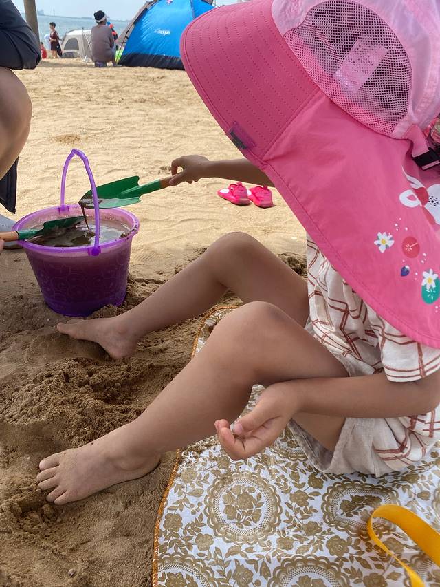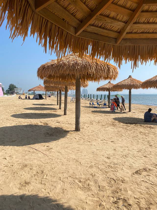 上午在海边玩的沙子,海边有两排茅草撘的小亭子免费提供给游客乘凉,但是得自己带地垫什么的。