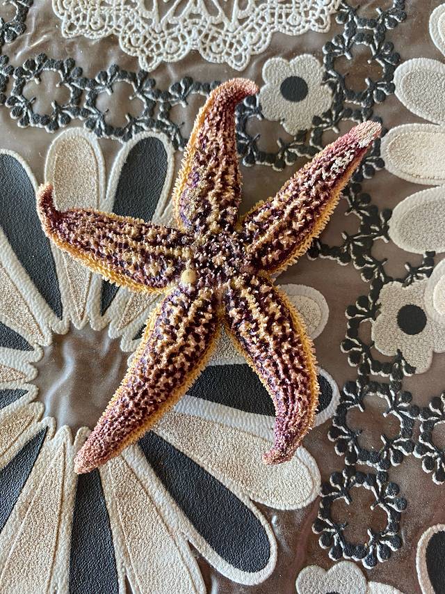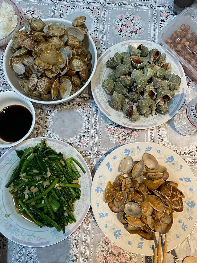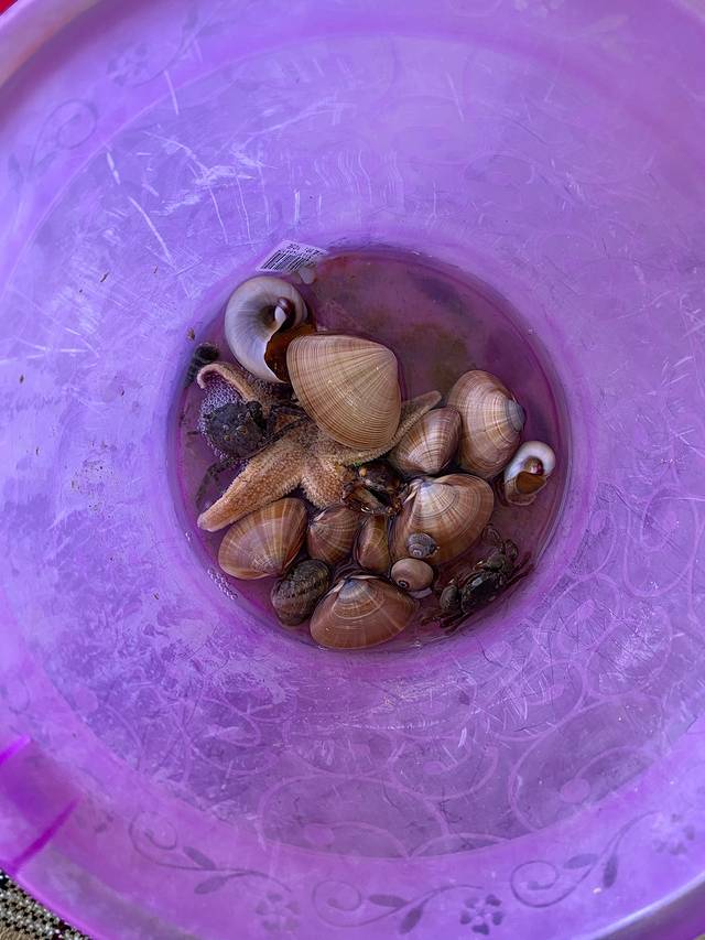 早上朵朵爸大清早去赶的海,捡了蚬子,还有海星、小螃蟹什么的。