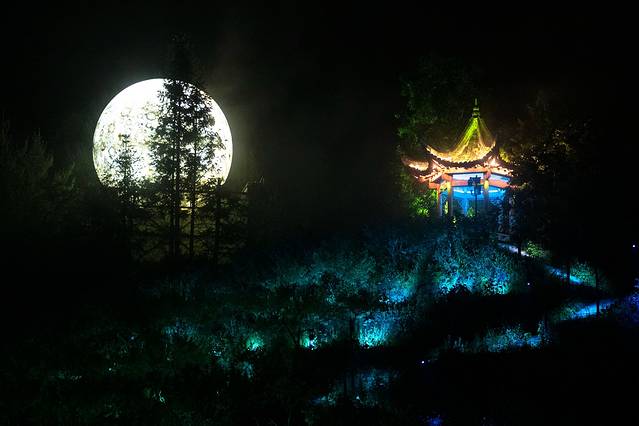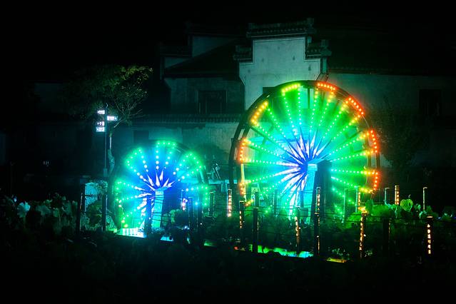 一轮皓月挂在观光亭身后,水车迤逦,秋千荡漾,夜色中的西递安静悠然。
