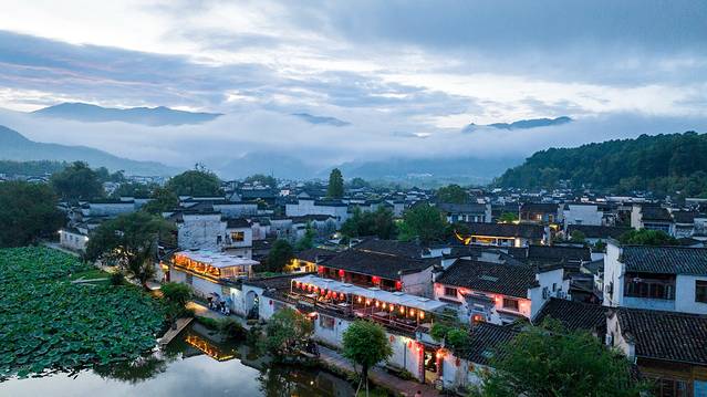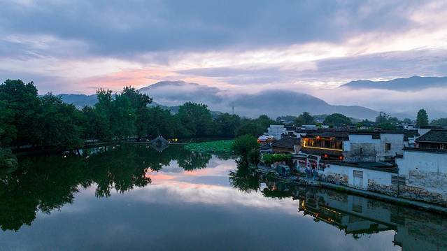 华灯初上,烟霞漫天,黄昏时分是宏村夏日最惊艳的时刻,有人说一下雨,黄山就成了徽州,雨后的宏村则化身为最具江南风韵的美丽画卷。