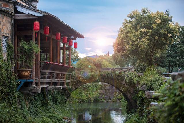 卢村村头的一座石桥,和河岸的亭廊灯笼、黄色花木相得益彰,在晚霞的映衬下,美成了一幅浓郁的油画。