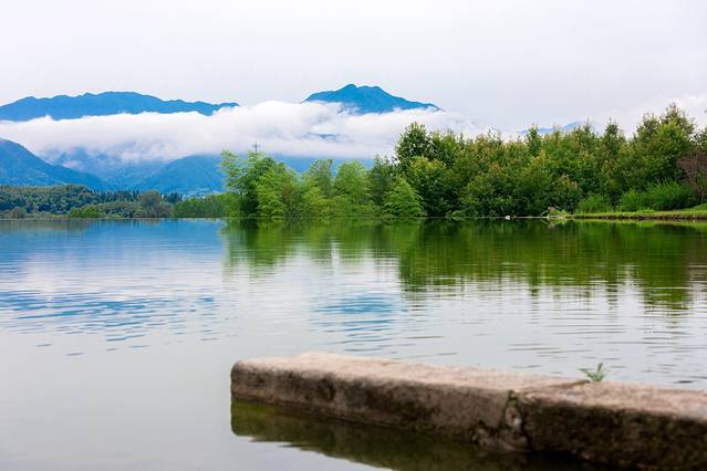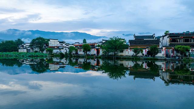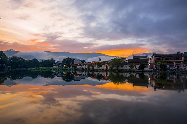 从宏村南门进去,首先映入眼帘的便是牛肚南湖,每每雨后初霁,远处青山云蒸霞蔚,湖中粉黛倒映,好似一幅徐徐展开的山水田园画卷,和杭州西湖“平湖秋月”有异曲同工之妙,因此被誉为“中国画里的乡村”。