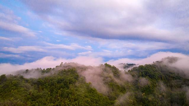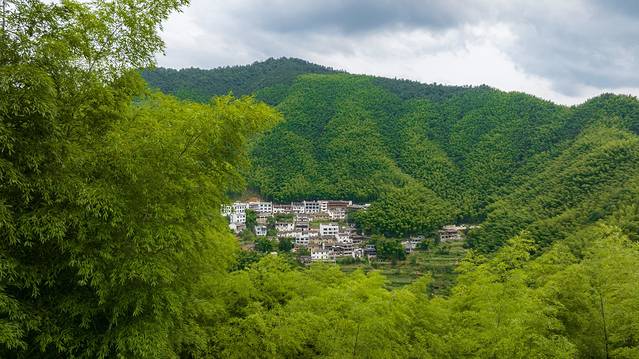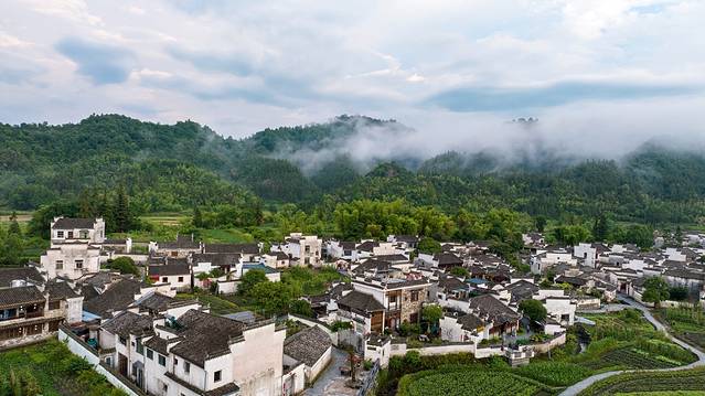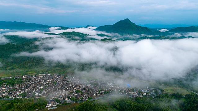 清风徐徐,竹叶婆娑,翠竹深处,白云人家,白墙黑瓦的民居,鳞次栉比依山势而建,雨后山间云雾缭绕宛若仙境。