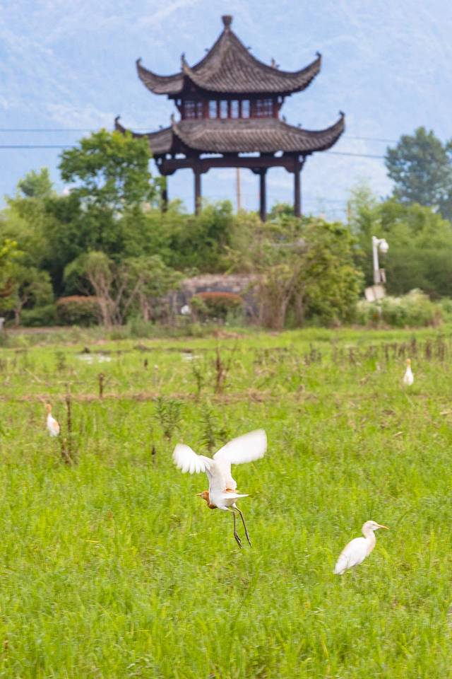 村外翠绿的稻田中白鹭绰绰,亭台倒映,好一幅美丽的田园画卷。