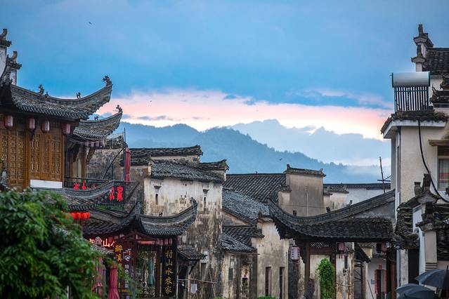 刚刚在卢村还是大雨滂沱,这厢到了西递却又霞光满天,这就是黟县夏天里的浪漫惊喜,山间云雾缭绕,在落日余晖的照射下,整个村落蒙上了一层温柔的淡紫色,在短短的几分钟里色彩变幻。