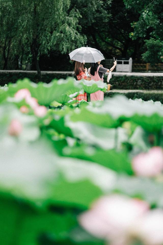 入夏菱荷香,镜面净为扫,穿过画桥,荷塘中荷花娇艳欲滴。