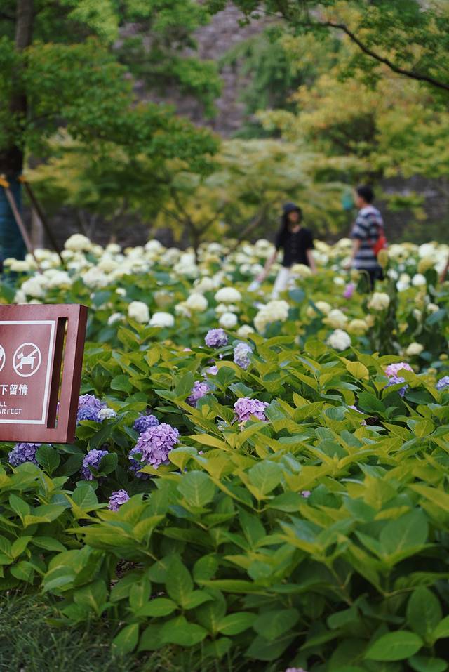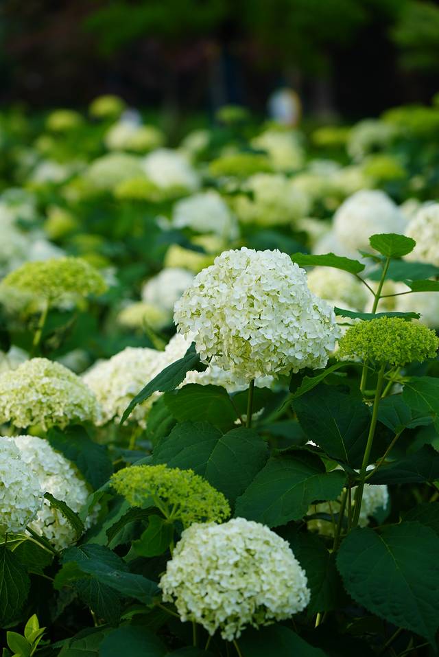 作为一个小众公园,绣球公园总是美得低调。进入绣球公园,就能看到路两边成片的绣球花,花枝不高,花团却十分紧凑,一团团的堆在绿叶中,洁白无瑕。