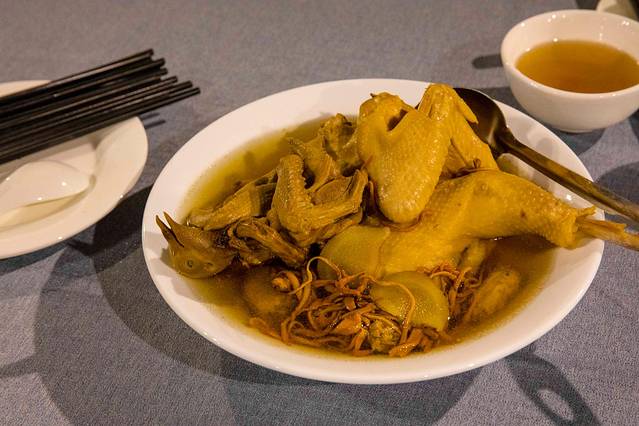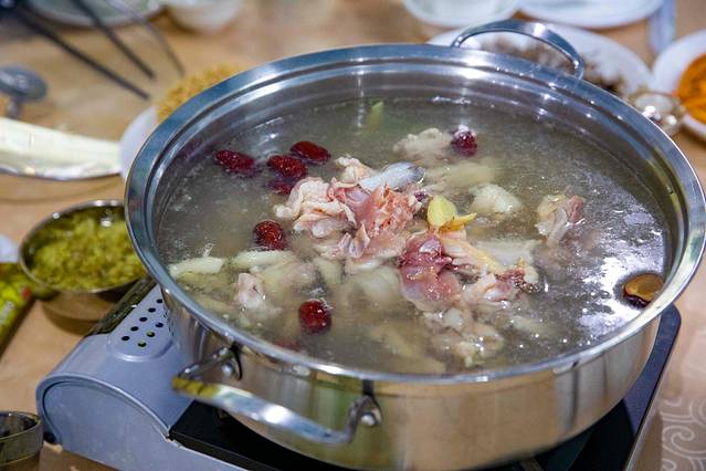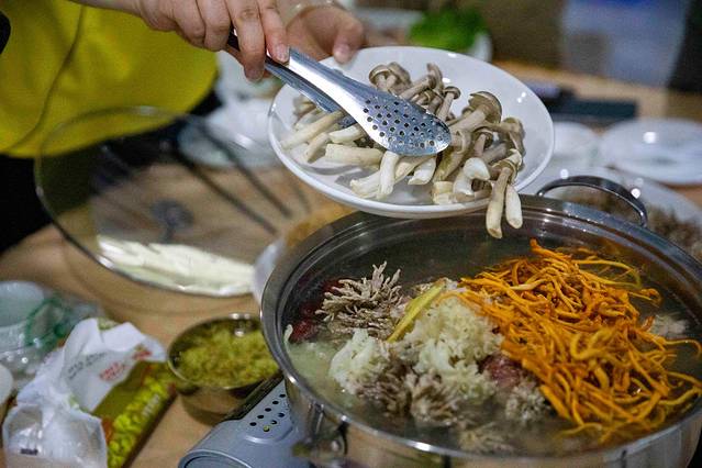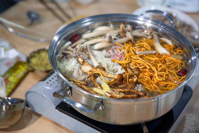 各式各样的菌类汇聚成一锅美食,眼前的虫草、绣球菌都是我的最爱,大火沸腾后一定要先喝鸡汤,汤才是这锅美食的精华所在。
