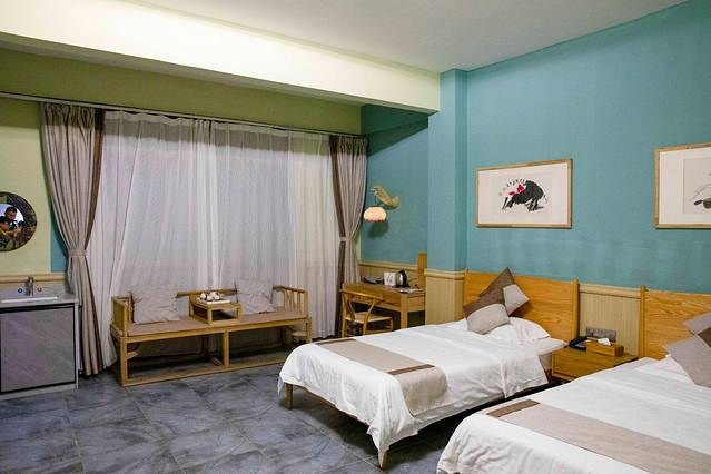 客栈内部设计风格以禅风诗意为主,原木色的中式家具,搭配清新蓝色的颜色,强调贴近自然,以传统文化释义自然禅意,予人以安静清幽之感。