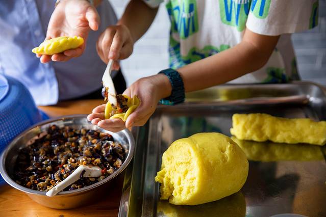 珠玑古巷里还可以自己动手包饺俚糍,这是一种韶关特色的传统小吃。饺俚糍主要由酸菜作馅,后来发展到辣椒酸笋茄子、萝卜干馅,也可加入各种肉类。