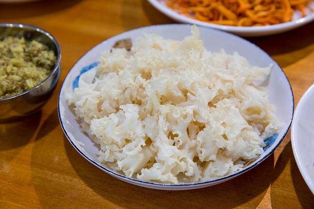 海蜇头捞鸡是一道很清爽的凉拌菜,鸡肉很有嚼劲,简单的作料让鸡肉的鲜美更加突出。