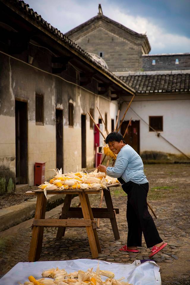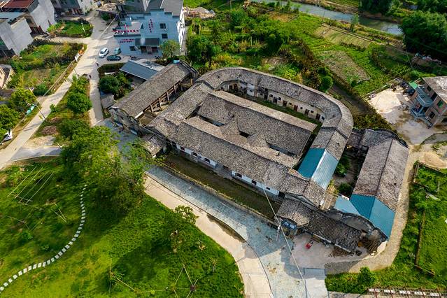 覆盖稠密青灰瓦的屋檐,错落在窗框里像一幅素描画。最后一进椭圆形的壮丁房画出优美的弧线,从前是下人住的,也是围屋最外围的建筑。