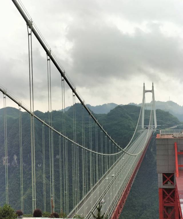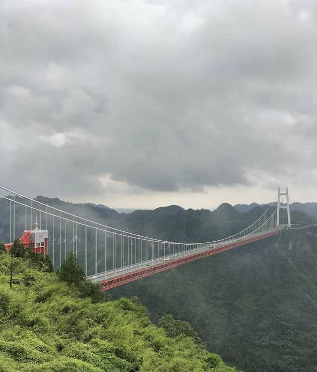 矮寨特大悬索桥(简称“矮寨大桥”)临架于峡谷之上,2007年开工,2012年3月通车,是包茂高速(G65)跨越德夯大峡谷的一座特大型桥梁。矮寨大桥为钢桁梁单跨悬索桥,主跨1176m,桥面宽度24.5m,桥面距峡谷底部高度达355m。桥梁建设中创造了“四个世界第一”,展现了人类以工程技术征服天险的魄力与勇气,被誉为桥梁建筑艺术与自然景观完美结合的典范。