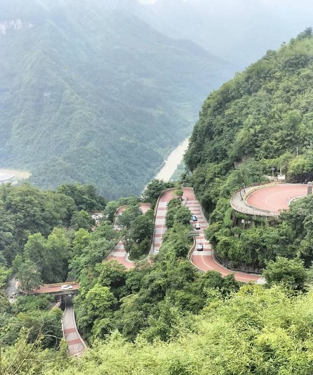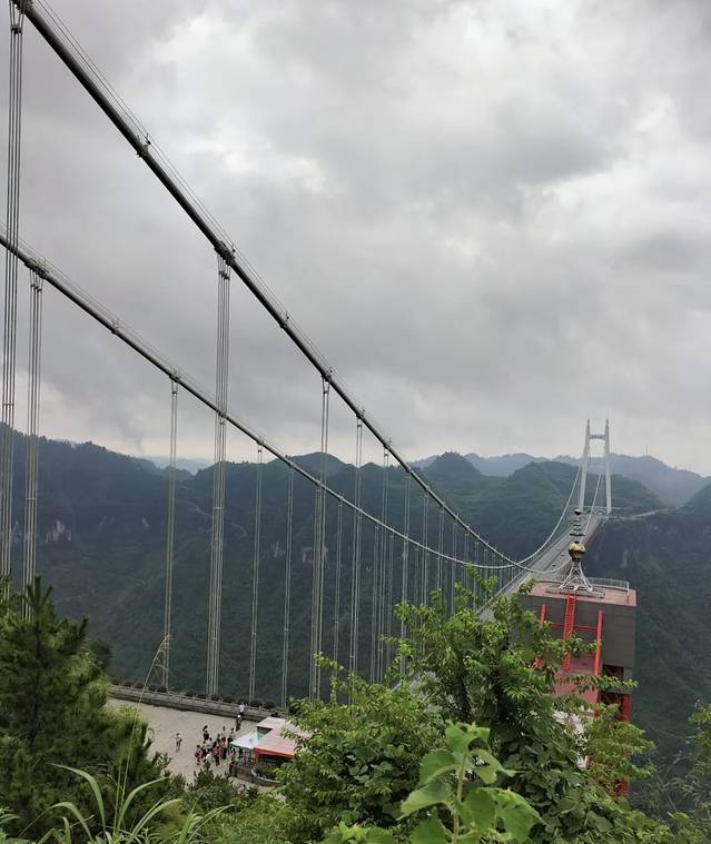 从观景台上俯瞰矮塞盘山公路,这条建成干1937年的湘川公路上最险关卡。是抗战时期中华民族救亡图存的生命通道,也是当年中原通往大西南的唯一通道。其地势之险要、工程设计之巧妙居当时全国公路之冠,被称为“矮寨公路奇观”。它长6.1km,修筑于水平距离不足100m,垂直高差440m,坡度为70-90度的同一坡面上,地形迫使路转折13道急弯,形成26段几乎平行的路面,层层选起,直冲云霄,被誉为世界公路史上的奇观。这条路还诞生了中国公路史上第一座立交桥,山顶的“开路先锋”雕像铭记了当年筑路者们的艰苦与卓绝,牺牲与付出。矮寨特大悬索桥