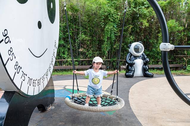 咖啡馆边上是一块无动力儿童游玩区,黑白相间,到处都是熊猫的造型,有滑滑梯、跷跷板、荡秋千等,好玩又好拍~