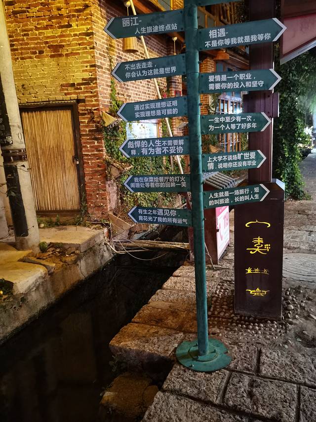 走到四方街,看到纳西阿妈和游人一起跳民族打跳(纳西三部曲),了解了大水冲街。顺着酒吧一条街,感受古城酒吧街的热闹,就是那种慢摇吧的景象。只是在几百年的古镇,蹦上了现代的迪,感觉跟古城的格调不太搭,却适合大家对丽江理解的艳遇。我们路过闹吧区,再走过清吧区,在霓虹的灯光下,站在小河边请路人帮忙拍了合照。向古城北门走去,这里有大水车,江泽民的题字和城墙壁画,三景构成一体,展现出丽江古城这座历史文化遗产的壮观。