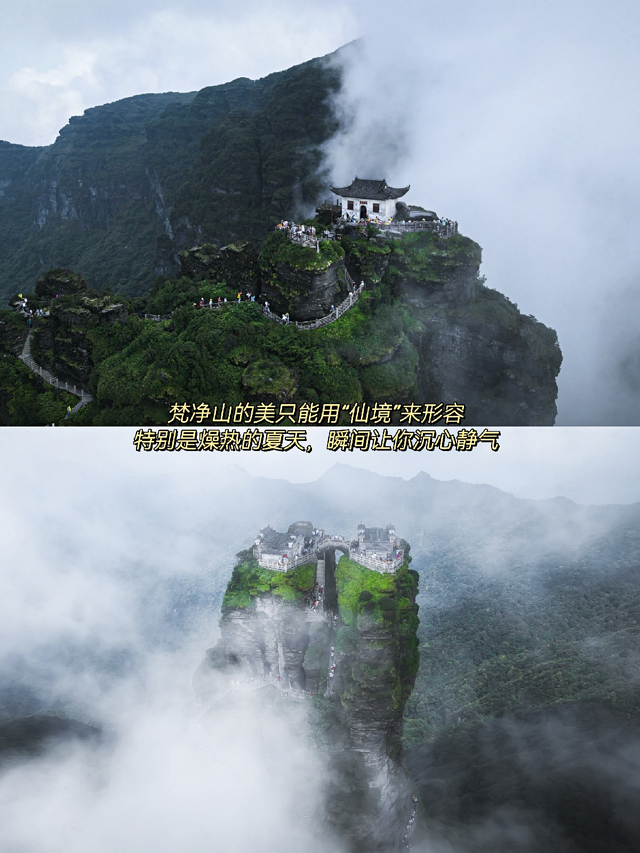 梵净山金顶山峰中部有裂痕,将金顶一分为二。两边各有一座寺庙,一边奉释迦佛,一边奉弥勒佛。远看特别像童话世界。
