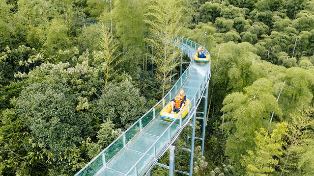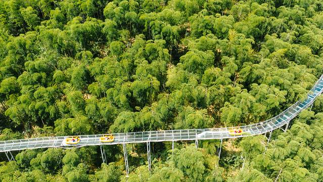 航拍视野下的竹尖漂流玻璃滑道,宛如一条白丝带,飘扬在郁郁葱葱的绿色竹海之上。星潮营地团建基地场地也很大,集轻奢露营、烧烤、团队篝火、团建项目场地、毕业打卡墙于一体。步行到这,大约5分钟。UTV专用道路,位于景区深处封闭山区,如果有机会,你也不妨去体验一下,操纵着UTV,驰骋在蜿蜒的山路上、竹荫下。感受一把地面的“速度与激情”,再去体验水陆空的“速度与激情”,那必定刻骨铭心。