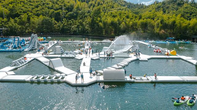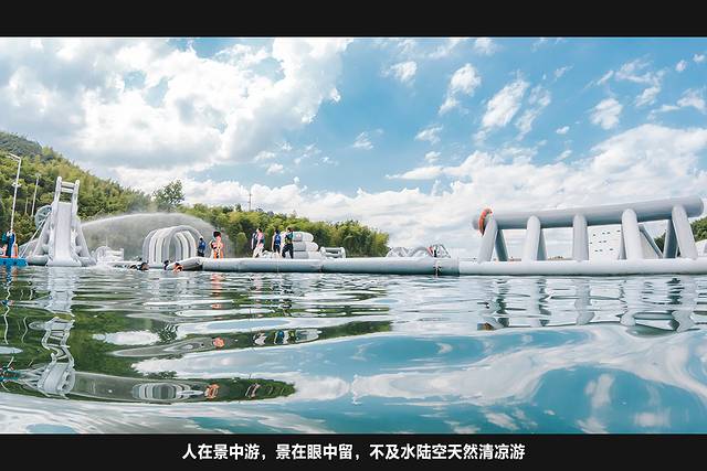8.舒适体验。停车-购换票-存放换装-坐景交-开漂,最快不超5分钟,不排队,不拥挤。一站地畅快玩水,360水陆空清凉,令人愉悦。竹尖漂流全程6分钟,虽晒但时间、速度快,山风拂热,还是比较舒适。水上冒险岛、漂浮闯关平台、桨板皮划艇等项目,一票制无限畅玩。