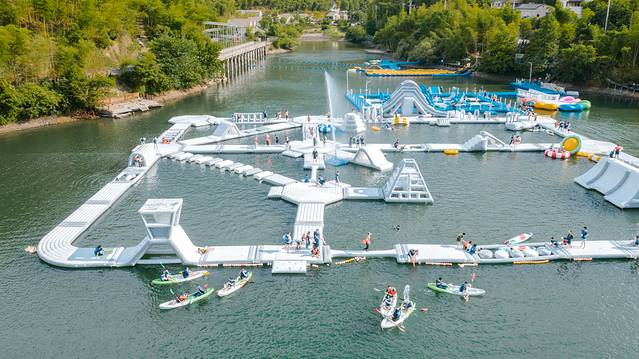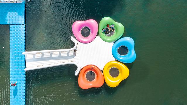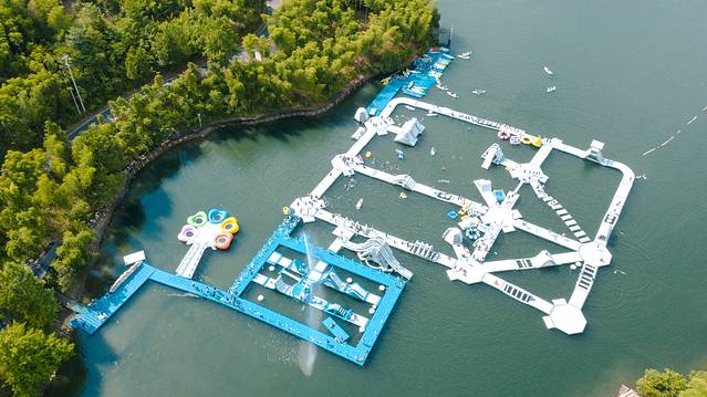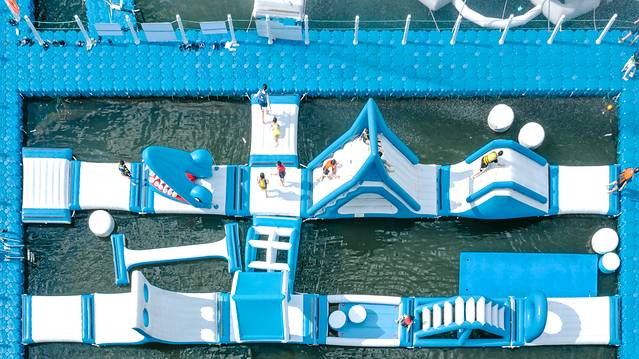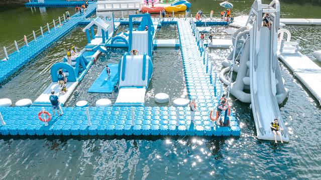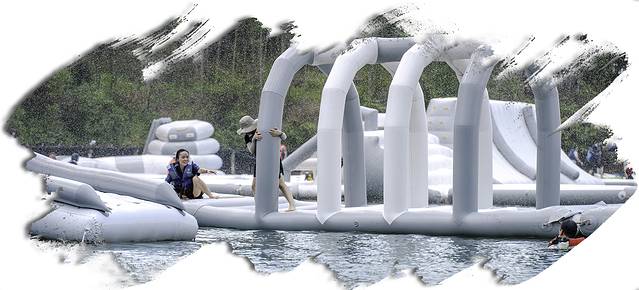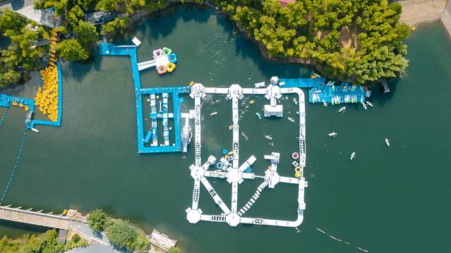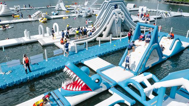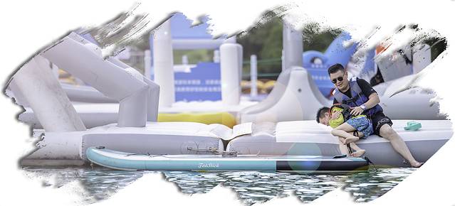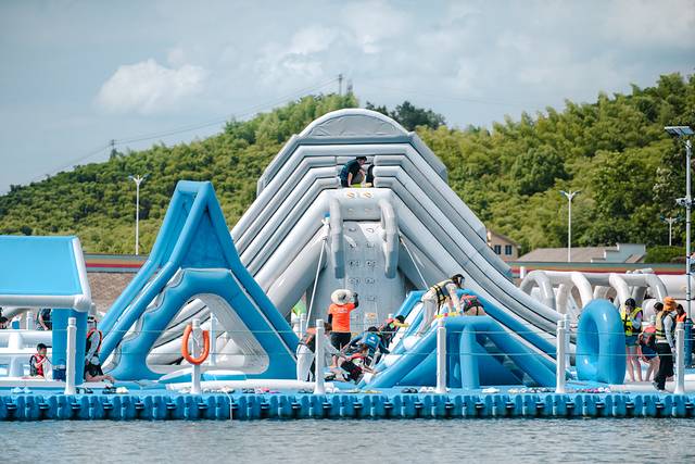 水上冒险岛,亲子欢乐岛。比水世界更自由自在,无须等“浪”和等“水”倒下来。比泳池体验度更佳,喜欢花式跳水,可尽情尝试,没有坚硬的地面、尖锐的泳池边。网格式水上平台,飘摇不定的漂浮板、超大号跷跷板、蹦蹦云、犹如水上攀岩的水上攀爬、垂直大滑梯、充气滚筒、独木桥等各具挑战性的水上冒险,分布其间。燃烧的斗志,在盛夏更为灼热,不如来一场透心凉的勇闯天涯。亲子上阵、团队竞技、情侣组队,都是不错的选择。