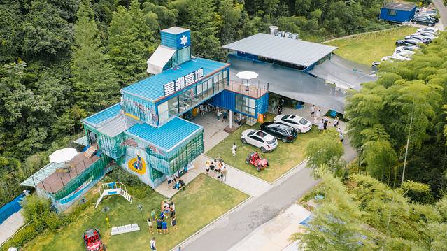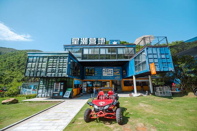 从主干道驱车进入景区道路,林荫漫漫、山路平坦、蓝天白云、蝉鸣鸟叫,一切让人内心不由得愉悦!景区地处安吉县中心腹地,周边也是僻静隐秘。导航直达游客中心,醒目的蓝色集装箱房,很潮、很有现代工业风气息。星潮采用现代化、绿色环保的集装箱房作为游客中心场所,这本就是一大打卡地。草坪上的红色UTV瞬间让游客燃爆心中的狂野期待。手绘则是星潮代表性的体验——竹尖漂流。两层布局、品字型堆叠的造型,还有2处惬意的观景平台。哦对了,游客换购票中心在一层左侧,中间为游客检票通道,一层右侧则是寄存和换洗中心。