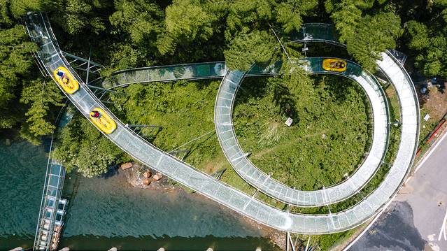 游客上山、下艇井然有序,一切安全措施检查完毕,逐渐放行漂流~虽然说安全距离是15米,因为每条艇的载重不一,难免在下漂过程中,会有追尾小碰撞的情况,不过只要坐姿正确,双手不伸出滑道外,一切都没问题。