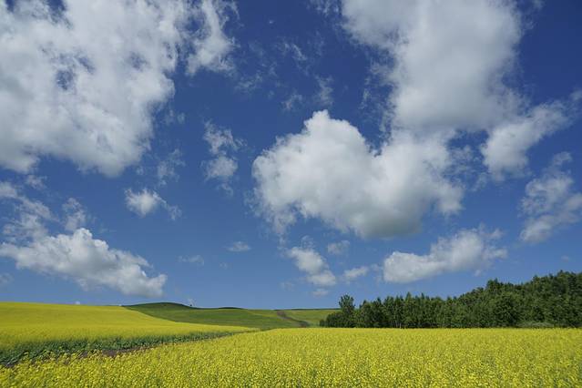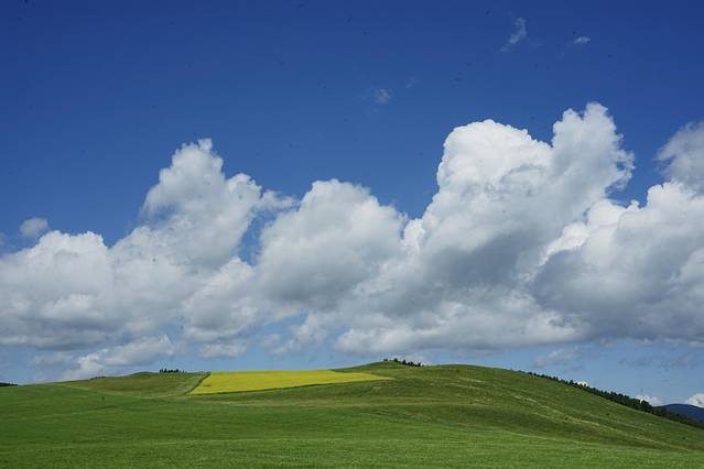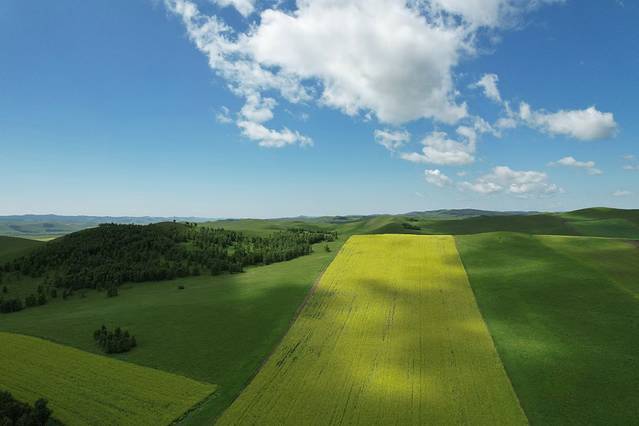 额尔古纳湿地的徒步和前日的河畔徒步不同,今日亮点是大片大片的油菜花田。油菜花的金黄、草原的绿、湛蓝的天空与几乎低到地平线上的白云,构成了绝美的大地调色盘。