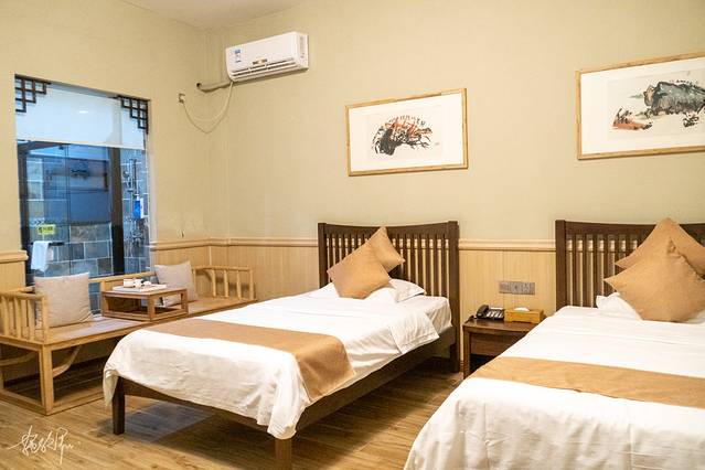 白墙绿瓦的外观,大堂处处能看到“禅意”的设计风,流水、金鱼,佛头、荷花,整个感觉都渗透着平淡质朴的韵味。进入房间是温暖的原木风格,这个风格似乎过了几年都不会过时,怎么看都还是舒服的。