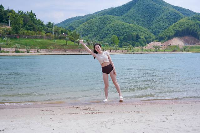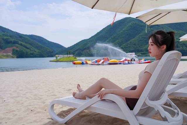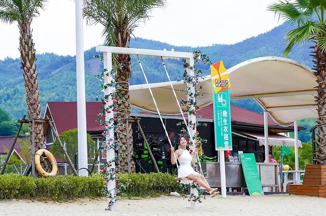 喜欢拍照打卡的,入园可以先去阳光沙滩,荣耀天空之城的“小三亚”之名就是由此而来,很难想象在内陆的安吉,能有这样一片好看的沙滩,漫步松软细腻的白色沙滩,清风徐来,脚边浪花阵阵,湖水映照着碧水蓝天,美不胜收。