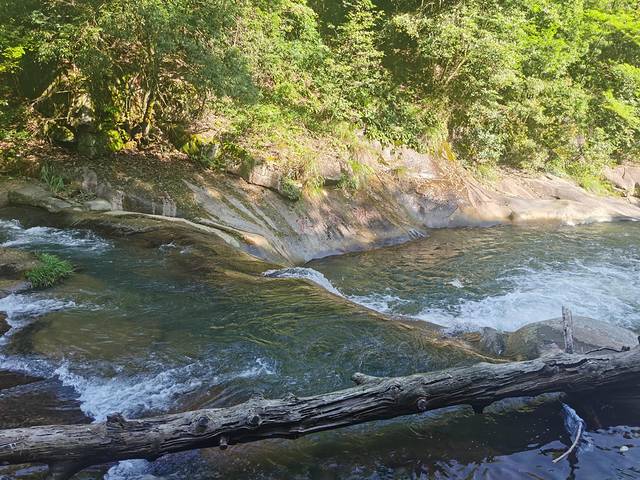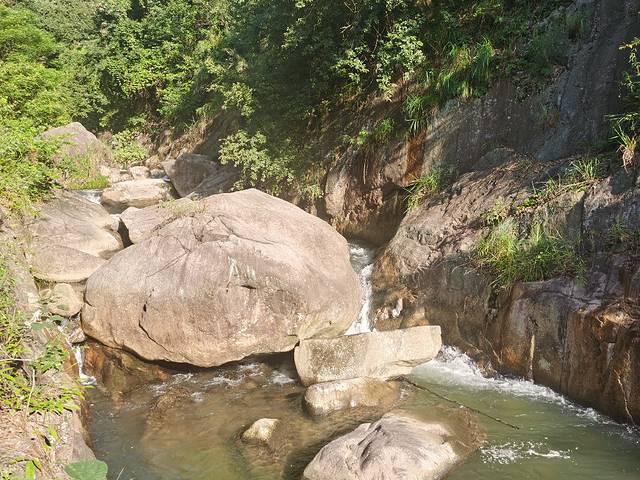 首先映入眼帘的,是东江湖旁边的高山之巅垂下的一条白色长巾,中间一段还出现弯折,似乎是被风吹的。龙景峡谷的瀑布大戏,就此展开。登山步道沿着溪流而建,路途险峻,溪水从高处跌下,发出激烈的撞击声。有时,会有一小段平坦的路程,溪流也变得暂时安静起来。瀑布下往往都会形成深潭,潭水碧绿而清澈。