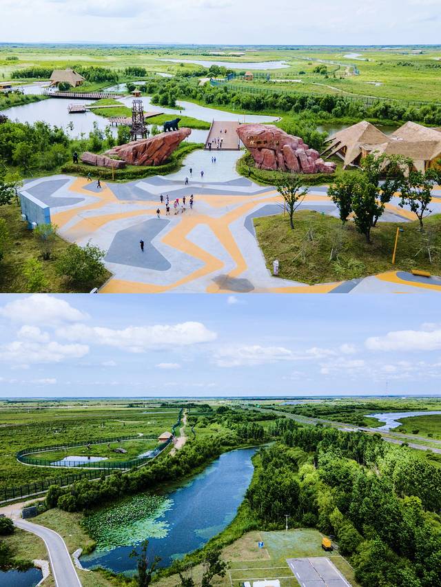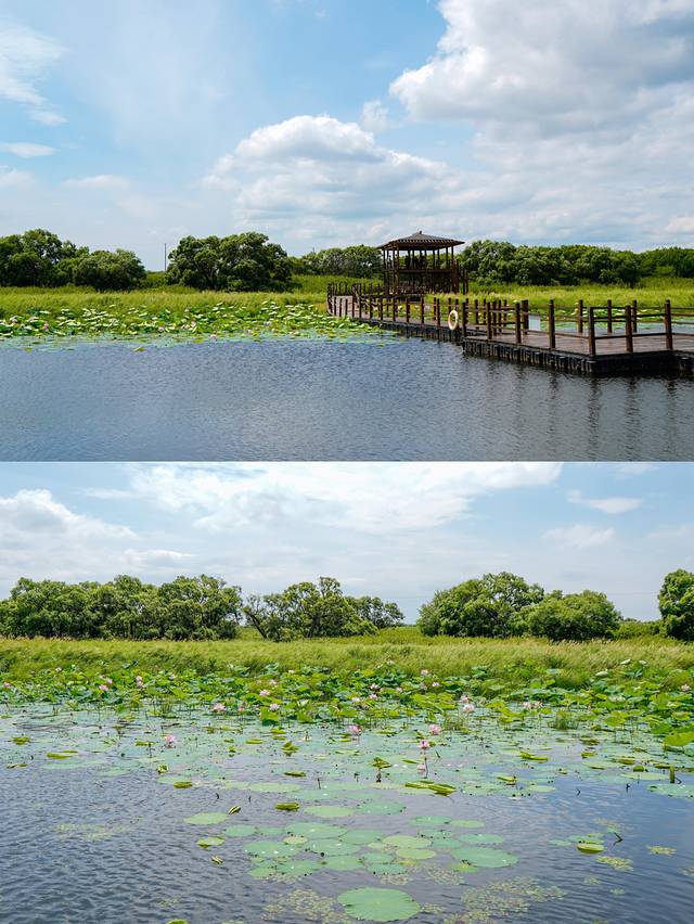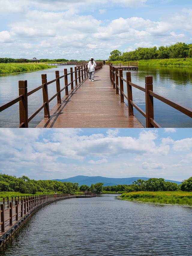 盛夏的湿地公园生机盎然、植被茂盛,天空倒映在水面,美不胜收,游客可沿飘浮式木栈道步行游览,飘浮式木栈道全长2256米,设计独具匠心,造型美观环保。