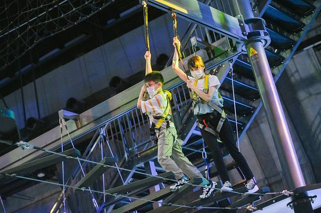 这个是【深谷勇者挑战】,刚爬上十几米高后我就开始后悔上去了。在高空绳索上要完成无数个艰难环节才能最终胜利。光胆大是不行的!平衡能力、手脚协调能力、身体柔韧性等等一个都少不了。